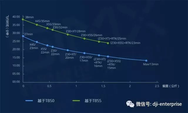M200系列在使用两种电池搭载不同云台飞行时间对比。