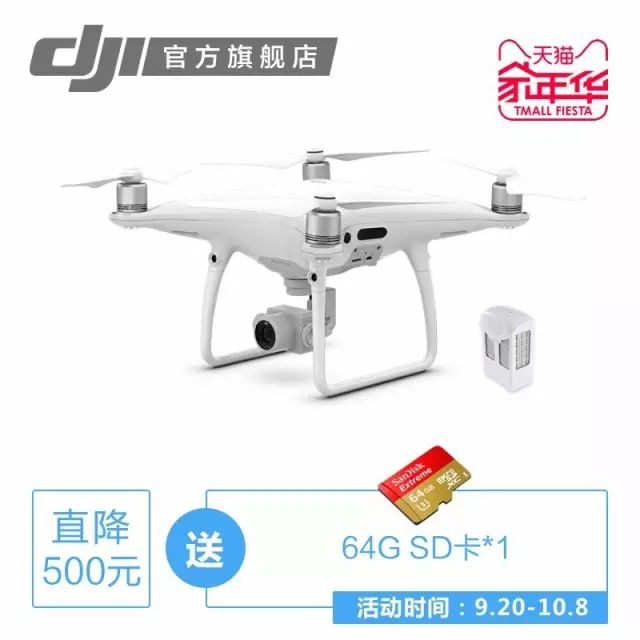 精灵4 Pro具有5向环境感知并可拍摄专业4K视频,适合想要拍出专业级别影片的航拍爱好者。现在国庆出游季精灵4 Pro双电套装直降500元,并赠送价值219元的64G SD卡。