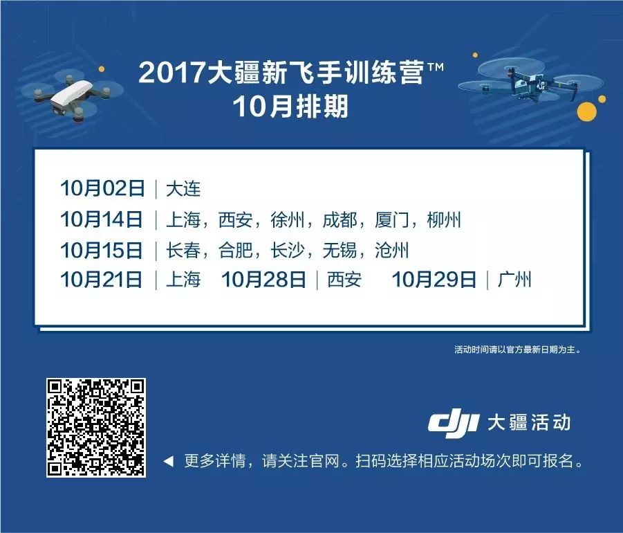 10月,大疆新飞手训练营将在图中多个城市开启,活动全程免费,无人机将由大疆提供。这是一个你不仅能和飞友一起飞飞机,还有精美礼品赢取的难得机会!大疆官网现正接受申请报名,马上来体验!
