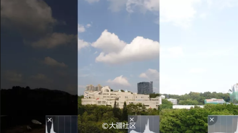这三张图片在同一时间拍摄,分别欠曝、正常、过曝,右下角是各自的直方图