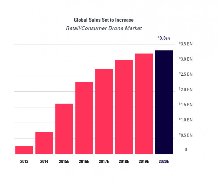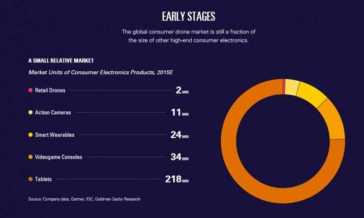 消费者市场现在是无人机最大的市场,但是在所有高端电子消费品市场中,无人机只占了很小的一部分。根据无人机公司、高纳德、IDC和高盛的数据,在2015年早期,无人机零售只有2百万美元,而平板电脑销售则有2.18亿美元。运动相机、智能手表、电子游戏机销售都达到了千万美元的级别。