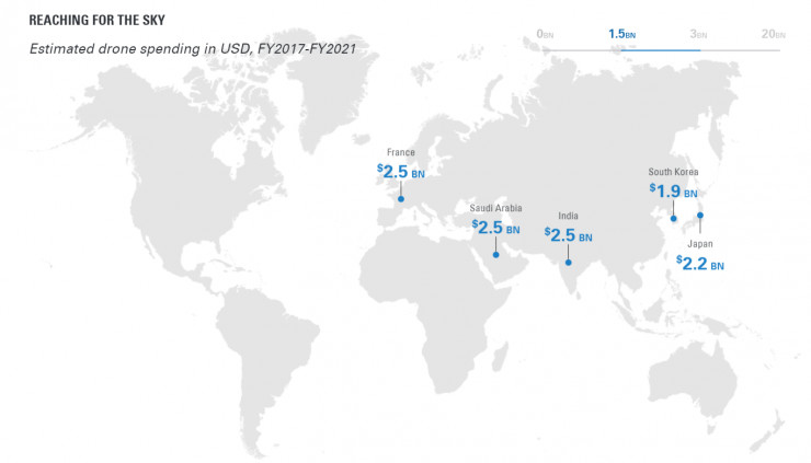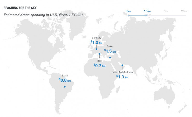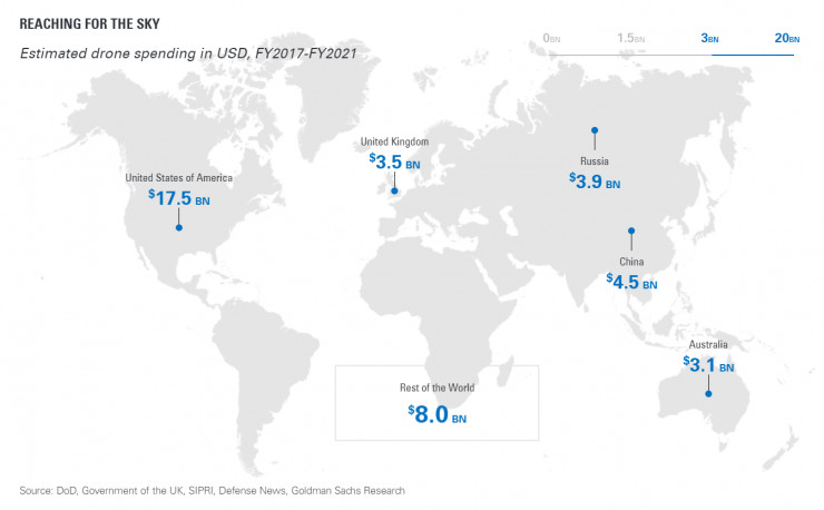 从2017财年到2020财年,高盛预测,在无人机的主要消费国中,在阿联酋、土耳其、意大利、德国、巴西等国,无人机的支出将会在15亿美元以下,而韩国、日本、印度、沙特阿拉伯、法国等地,用于无人机的支出将会在15亿到30亿美元之间。而中国、美国、俄罗斯、英国、澳大利亚等国用于无人机的支出则会在30亿美元以上。剩余其他国家大约会有80亿美元的支出。