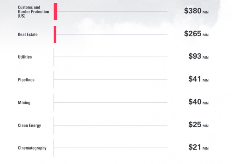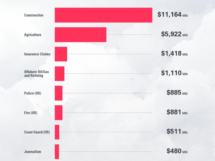 下图显示了无人机在美国的商用和政用用途,及其市场价值。无人机在美国在建筑业、农业、保险、石油等行业已经有了千万美元级的市场。但是在零售、采矿、电影制作等商用和政用领域,市场还没有完全打开。
