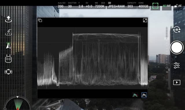 为配合禅思X7的优质影像表现力,更新后的DJI GO 4新增了“色彩示波器”功能,可辅助航拍拍摄中的色彩确认和颜色管理,可以在App中切换黑白或彩色示波器。