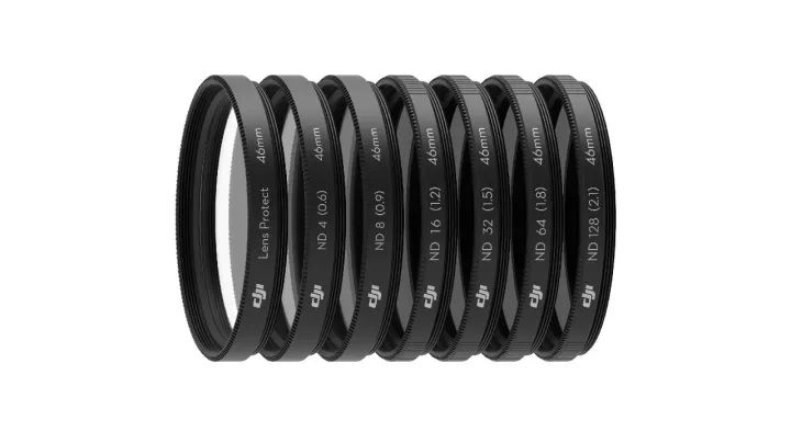 此外,DJI还发布了与镜头适配的ND减光镜套装,包含ND4至ND128等多档减光滤镜,以及一枚用于保护镜头的平光镜。如需要更高的减光等级,可以取下镜头遮光罩,使用双滤镜来获取更强的减光效果。