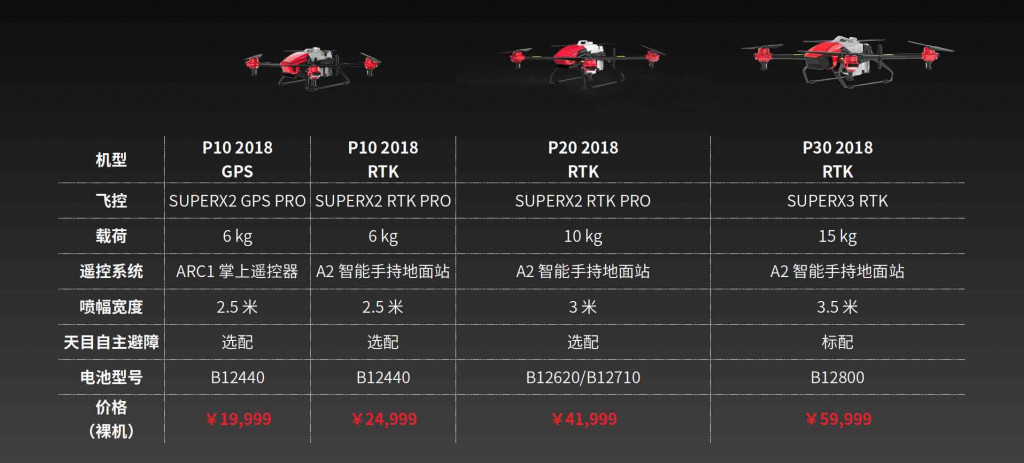 P20 2018 则搭载了 SUPERX2 RTK PRO 飞控,并支持云 RTK 飞行模式和移动、联通、电信三网自由通讯,以及 XCOPE 天目 自主避障,基于 30 米高精度仿地和全角 40°探测,其可适应全部地形作业;官方称模块化程度提高 50%,维护难度降低 90%;全新智能药箱能感知药液密度、温度、容量。