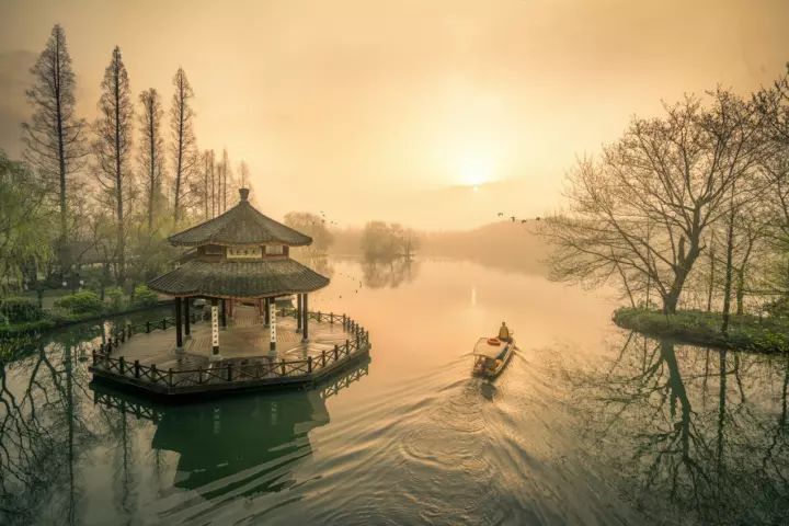 ①西湖景区日出,下图拍摄时属中度污染天气,图一为刚到日出时间,但太阳还没有跳出雾霾层的现场画面,图2太阳升起来到一定高度时,逆光快门拍摄。