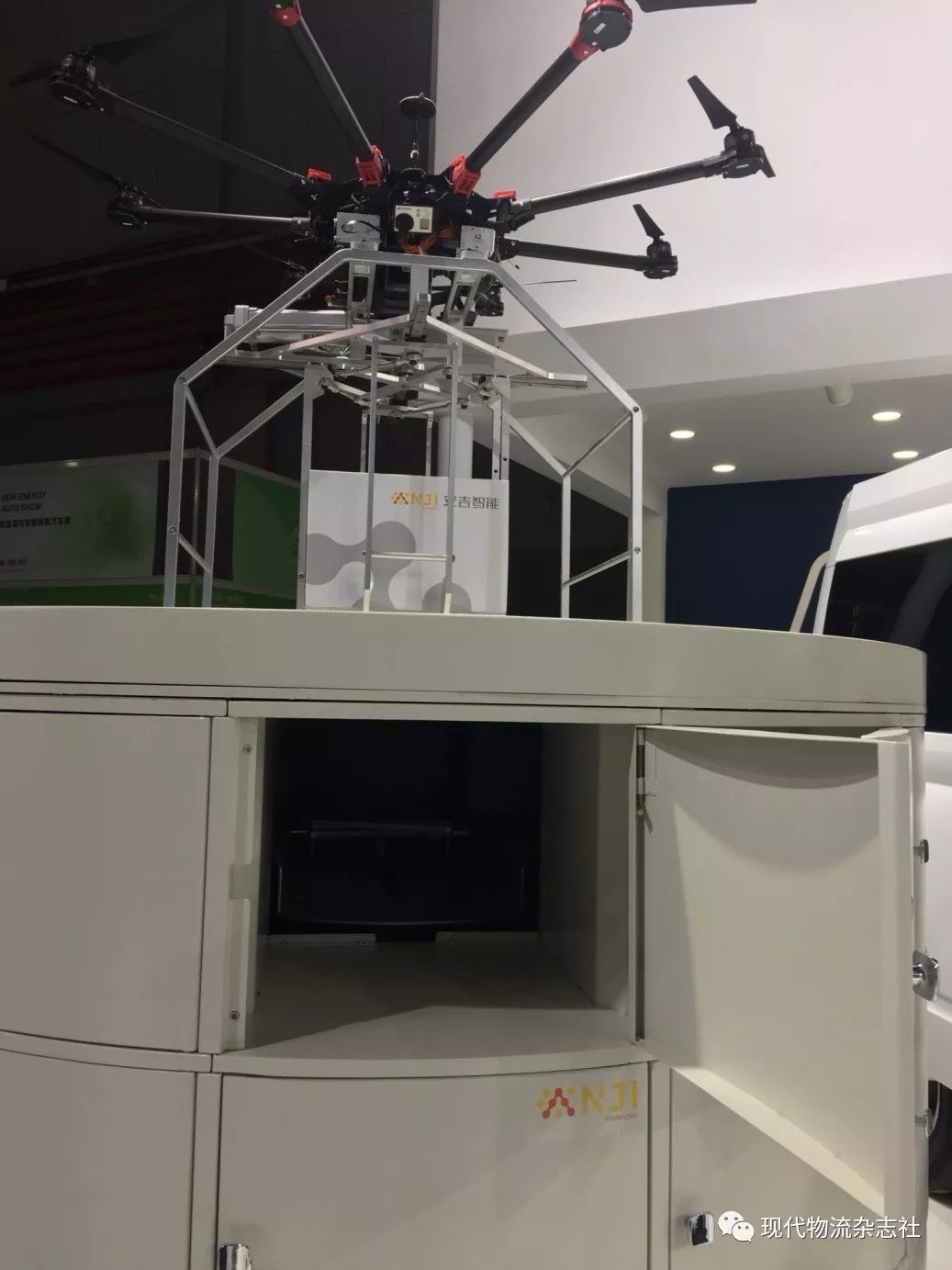 物流车到达目的地后,利用车载堆垛机将货架上的货物移动至副驾驶位处的出货口快速人工出货,或者车顶天窗位的出货口,由无人机夹具自动抓取货物后,停靠在安心柜顶部中间位置。无人机释放底部夹具,将货物放置在蜂巢顶部。安心柜中间有机械结构可以升降,旋转。中间内芯把货物包裹降到指定层高,旋转到指定货柜,在货柜背面将包裹推入货柜。无人机载重量达10kg,载货尺寸最大可达300×250×200mm,可实现多货型兼容并自动返回。智能物流配送系统包裹出库效率达60个/小时,大大减少人员投入,有效提高了货物的派送效率,解决“最后一公里”配送难题。
