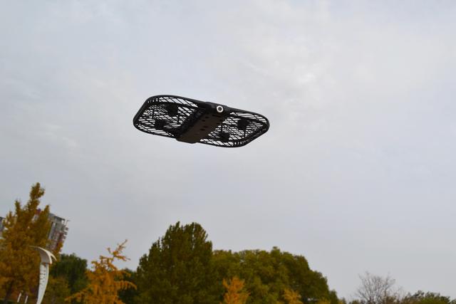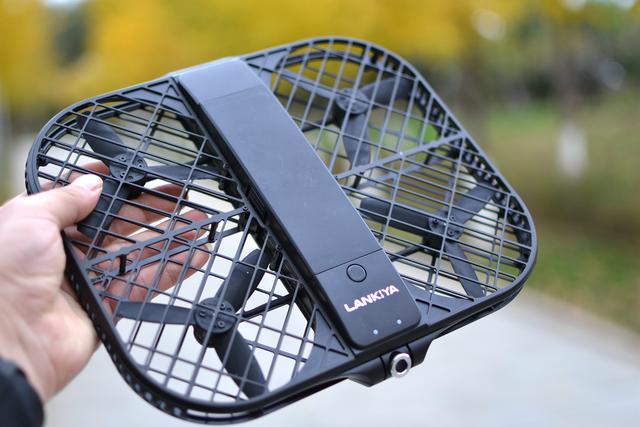 对比大疆那种旋翼无人机,Lankiya掌飞相机显得非常小巧便携。整机尺寸为248X219X36mm,和32开的书本差不多大小;进口碳纤维机身设计,安装电池后重量仅为300g,拿在手里非常轻便。无人机采用手机端App模拟操控,更是少了携带遥控器的烦恼,日常使用时可以轻松放入包包,随用随取,很是方便。