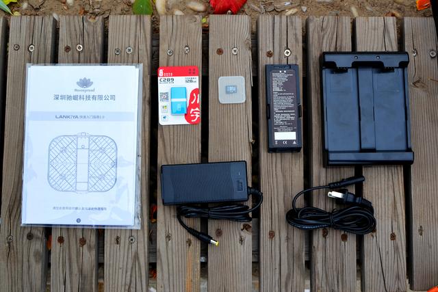 包装下层为Lankiya掌飞相机的配件,包含了:电池、电源适配器、电源线、双充底座、TF卡、读卡器以及产品说明书。产品标配为一块电池,容量为1250mAh,续航时间在10分钟左右,如果觉得不够需自行配置。充电底座采用双充设计,如果用户有2块及以上电池充起来会非常方便。