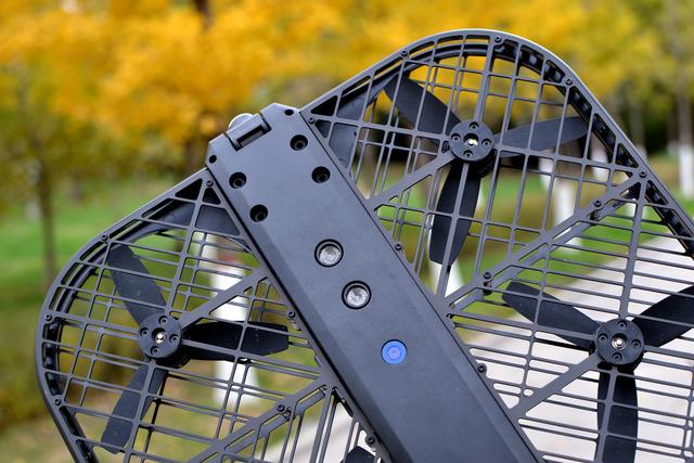 机身前端为电源键以及状态指示灯,搭配前置摄像头看起来就像一只小蜻蜓。电源键担任开关机、解锁飞行以及待机功能,像两颗小眼睛的状态指示灯则对无人机的状态进行提示。Lankiya掌飞相机在安全起飞前会有一个自检过程,自检是否通过就是依靠指示灯进行确认。