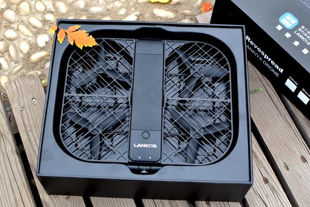 包装内侧为双层设计,Lankiya无人机被安置在顶层,开盒就能看到。此次Lankiya掌飞相机共推出黑色和白色两款机型,这里的为黑色款。掌飞相机为方形圆角扁平结构设计,采用4片3叶螺旋桨。