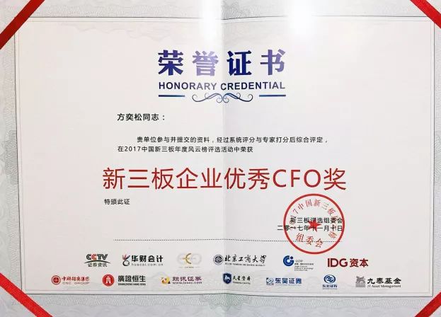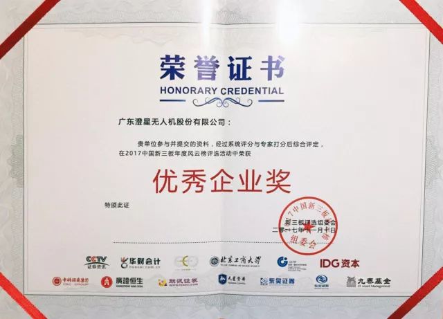 评奖依据华财新三板投资者保护指数、财务指标等基本入围条件,经主办单位组织专业机构与专家严格评选,结合网络票选,历时3个多月,最终确定获奖名单。凭借综合实力,澄星无人机最终在2017中国新三板年度风云榜中荣获“优秀企业奖”,公司财务总监方奕松先生荣获“新三板企业优秀CFO"。