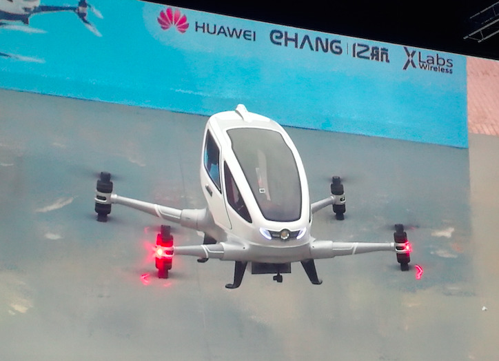 会场上同步播放的可载人无人机展示低空飞行