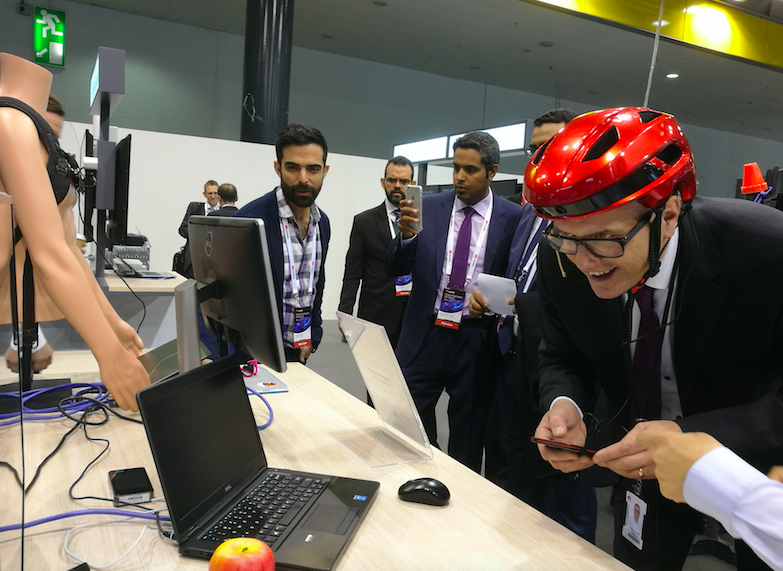 体验者在体验基于云端AI的导盲头盔