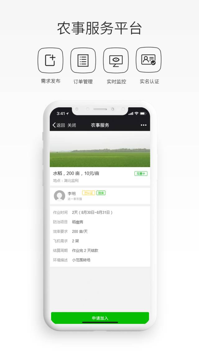 将用于刊登农事服务需求订单、接单和结算,让农户和植保队伍互相之间更容易对接,降低寻找服务和沟通的成本。