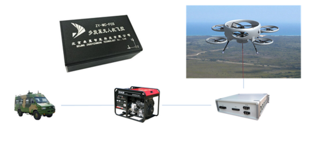 系留无人机作为高空基站的特点:地面发电机进行供电,24小时不间断滞空,系统可由卡车、船舶等平台装载,支持人工控制模式和自动控制模式(人工控制模式时,可通过摇杆控制无人机运动;自动飞行模式时,可实现无人机自动悬停和车载的自动跟随)通过地面站设置飞行高度,支持一键起飞,通过地面站一键降落和回收,运动平台(车辆、船舶等)静止时,无人机悬停在平台上方,运动平台(车辆、船舶等)运动时,无人机自动跟随平台运动。