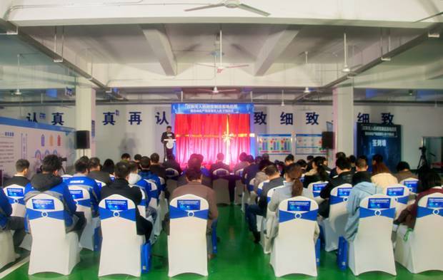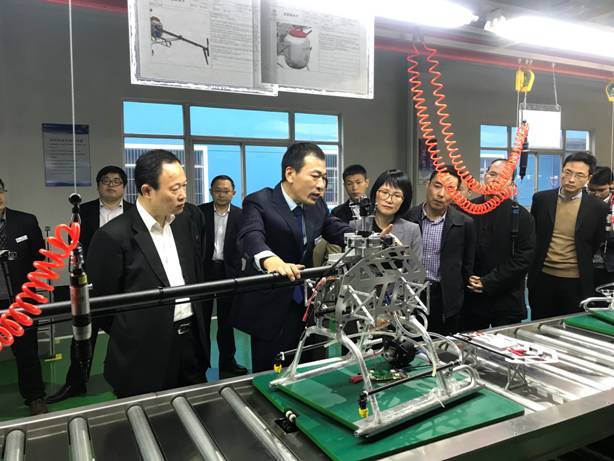 孙向东(前排左二)向参会嘉宾介绍汉和航空自动化产线