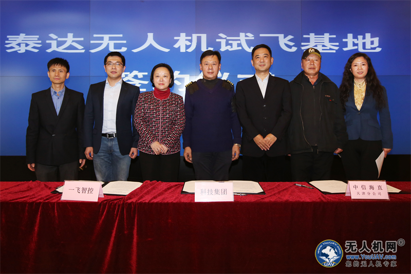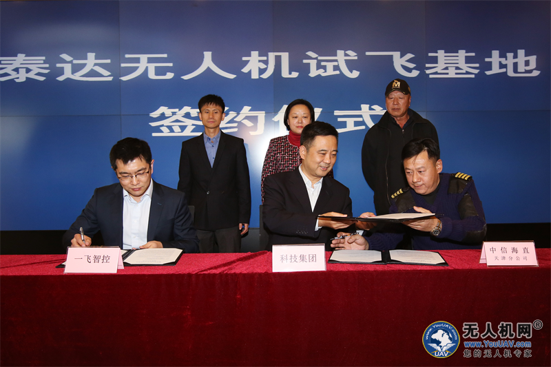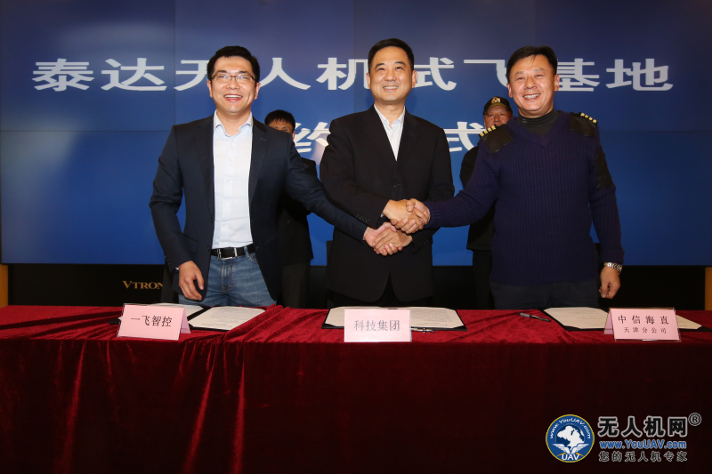 一飞智控董事长兼CEO 齐俊桐(左一)泰达科技总经理马杰(中)中信海直天津分公司党委书记、总经理李世栋(右一)