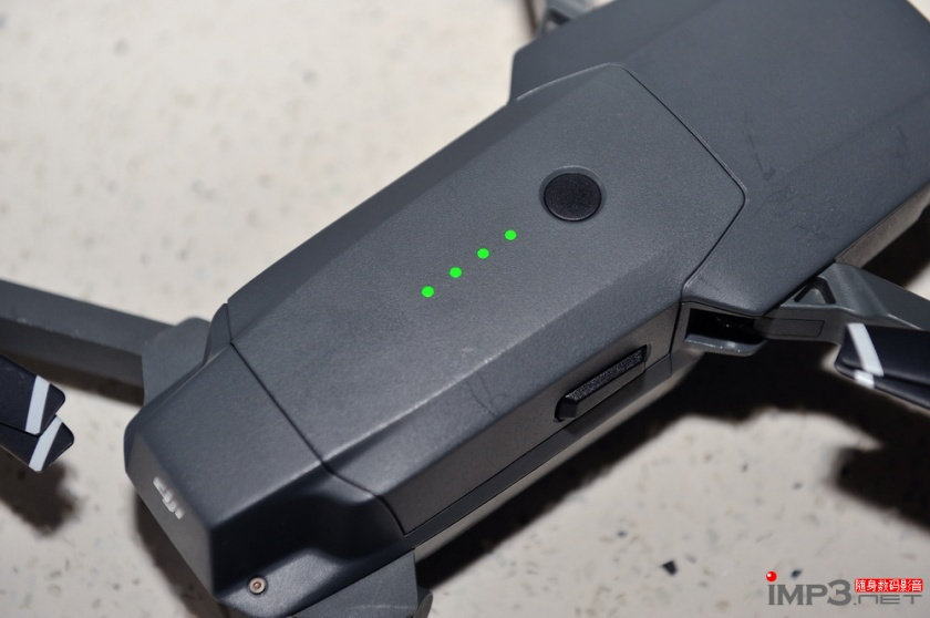 Mavic Pro的开机方式不走寻常路,按一次电源开关可显示电池剩余电量,短按一次接着再长按才是通电开机。并且在整个飞行过程中电量都会实时显示,另外在DJI的APP里还能够精确显示剩余电量,当然由于空中温度的关系,这个电量显示并非百分之一百精准,因此大疆设计了冗余返航、低电量告警等功能。