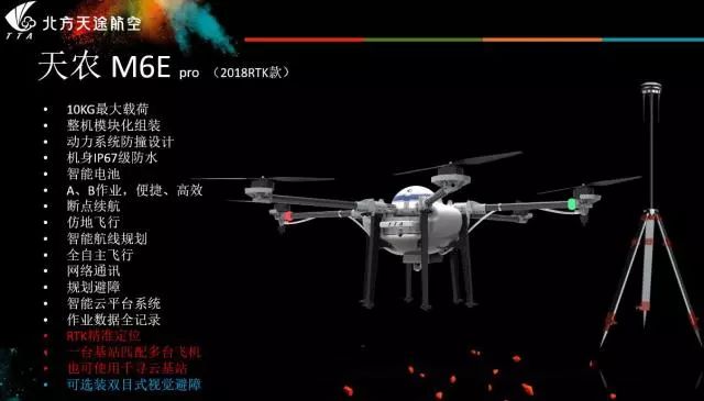 天途还发布了天农M6E(2018RTK版),这款无人机最大载荷10公斤,配备RTK基站,机身防水级别为IP67,可以进行AB点作业,具备智能航线规划、自主飞行、断点续航、仿地飞行等功能,这款产品的售价为41999元。八旋翼的植保机M8A 20A GPS版和RTK版,最大载荷为20公斤,RTK版同样配备了RTK基站。两款飞机的售价分别为79999元和99999元。