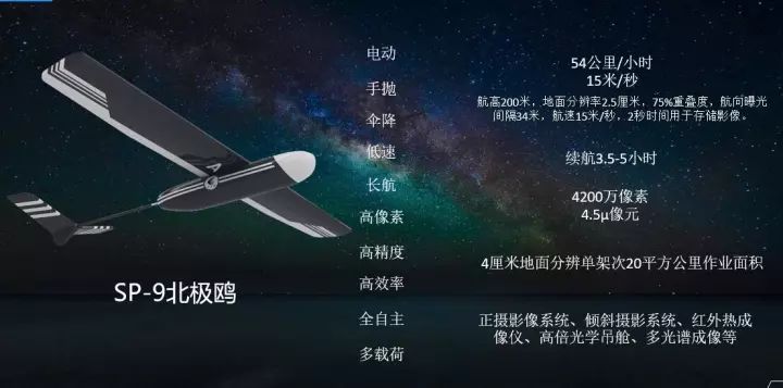 同时发布的无人机还有用于测绘的SP-9固定翼无人机,这款电动飞机采用手抛、伞降设计,航速为15米/秒,航行高度200米,地面分辨率2.5厘米,可实现2.5-5小时的续航时间,拍摄像素4200万。这款飞机可搭载正摄、倾斜摄影、红外相机、光学吊舱、多光谱成像仪等载荷。