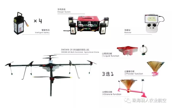 珠海羽人专注于精准农业和智能农用无人机研究与开发,通过功能创新和结构创新,其参展的谷上飞多功能大载荷农用无人机3WDM8-20是珠海羽人自主研发的农用无人机,拥有20公斤载荷量,同时使用一个飞行平台,快速更换3个不同功能(喷洒功能、播撒功能、喷粉功能)的本体,能满足全部作业需求。
