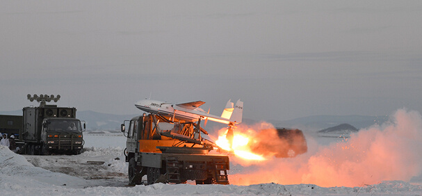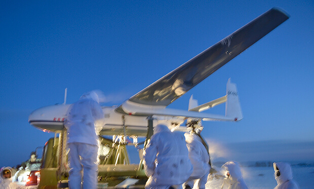 在东北的林海雪原,沈阳军区正在进行重炮校射无人机的实练。