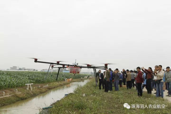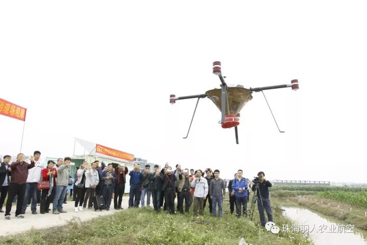 珠海羽人在观摩现场,飞手们演示了20L大载荷多功能农用无人机的喷粉、喷洒打药、颗粒肥播撤等功能。