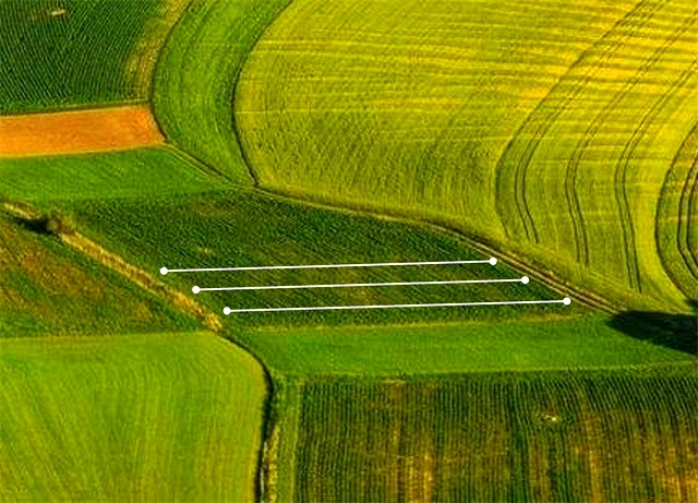 手动遥控无人机飞至农田上方,启用智能 AB 点功能,操控无人机向前飞行,无人机便可进入智能 AB 点模式,径直向前喷洒作业,当到地块的另一头时,按照设定喷幅向左(或右)切换航线,轻松完成不规整地块喷洒作业。