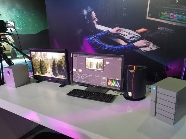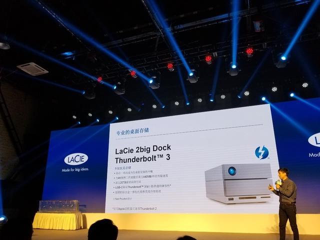 当然整场发布会的主角就是它了—LaCie 2big Dock Thunderbolt3,这款产品为2盘位RAID解决方案,可抽出式硬盘盒,采用了雷电3接口,可以兼容雷电2和USB,速度方面,现场演示的结果非常出色,在雷电接口下,速度可以达到450MB/s以上,在USB接口下也可以达到400MB/s左右,也就是说它可以在一分钟内传输长达一小时的4K视频素材。