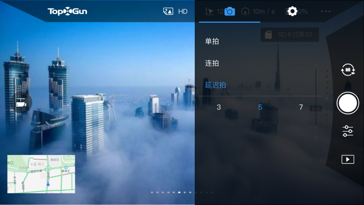 从软件截图中可以看到,新版的地面站云台界面中,上部为信号指示窗口,显示图传信号、飞行高度、飞行速度、电池电量、SD卡存储情况等一系列无人机相关参数。右侧为相机操作栏,可以实现拍照和录像功能的切换以及相机参数的调整。
