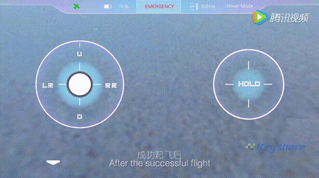 成功起飞后,APP界面会出现左右2个圆圈,左边虚拟摇杆控制飞行器的上升、下降,以及水平面的旋转。