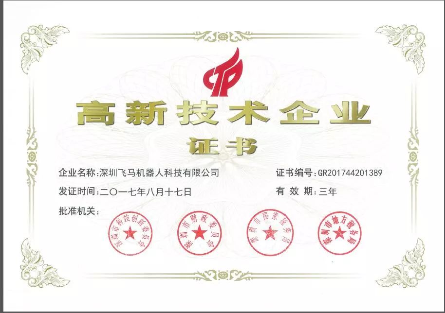 近日,深圳飞马机器人科技有限公司获得由深圳市科技创新委员会、深圳市财政委员会、深圳市国家税务局、深圳市地方税务局联合颁发的“国家高新技术企业”认定证书,正式迈入国家高新技术企业行列。