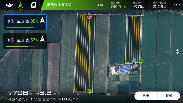 RTK 是载波相位差分技术(Real-Time Kinematic)的英文缩写,这是一种地理位置测量方法。借助该技术,植保无人机可以将定位精度提升至厘米级,航线轨迹精确可重复;双天线测向技术具有抗磁干扰能力,让无人机在高压线附近等复杂环境也能稳定飞行。