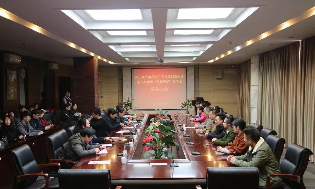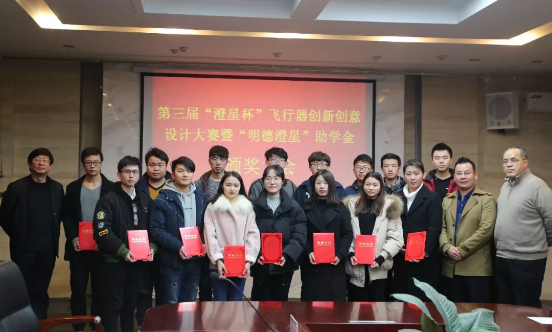 12月18日下午,明德学院第三届“澄星杯”飞行器创新创意设计大赛暨“明德澄星”助学金颁奖大会在明德楼407会议室隆重举行。学院院长吴丁毅、副院长李玉忍、无人机研发中心副主任魏生民、教务科研部部长邸鑫,广东澄星无人机股份有限公司副总经理管钦政、副总经理陈墨等出席了颁奖仪式,仪式由学院党委副书记沙治邦主持。