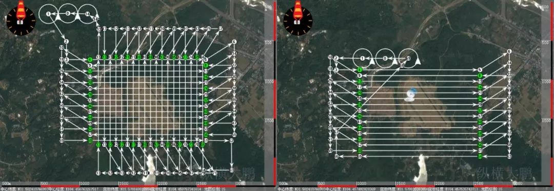 目前如果使用两拼或者三拼相机做航测,航线一般都为井字形航线,飞行架次多,效率低。CW-10大鹏搭载五拼相机的航线如右图,最简单的S形航线就能轻松完成任务。
