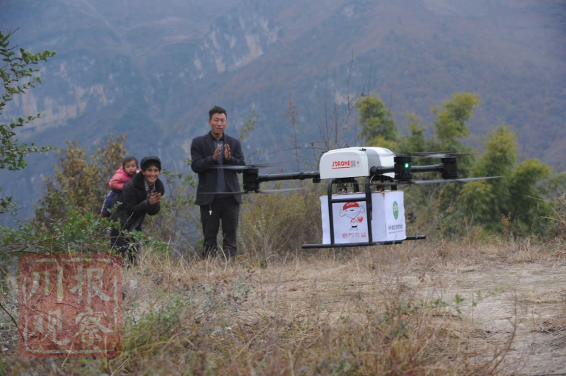 一架载有药品的京东无人机缓缓降落在“悬崖村”