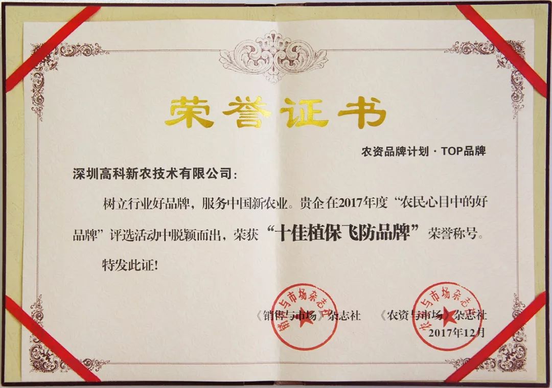 12月18日,第二十届中国农化品牌营销峰会在北京召开。会上,隆重举行了2017年度“农民心目中的好品牌”颁奖盛典。经过一年的综合评定与用户实名投票,高科新农 高票当选2017年度“中国十佳植保飞防品牌”,成为行业媒体眼中最受农民认可的植保飞防品牌。
