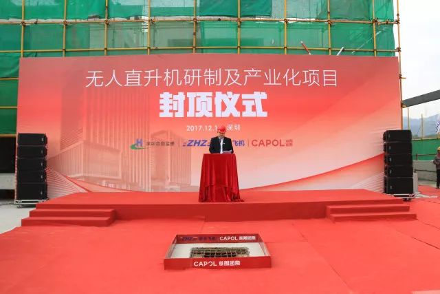 深圳市国防科技工业办公室军工处张慧副处长,北京理工大学原常务副校长、北京理工大学教育基金会理事长杨宾先生分别做了精彩的讲话,并对项目的顺利封顶表示祝贺。深圳联合飞机科技有限董事长田刚印代表公司做了精彩发言。封顶仪式的举办,标志着无人直升机研制及产业化项目进入了又一个重要阶段!