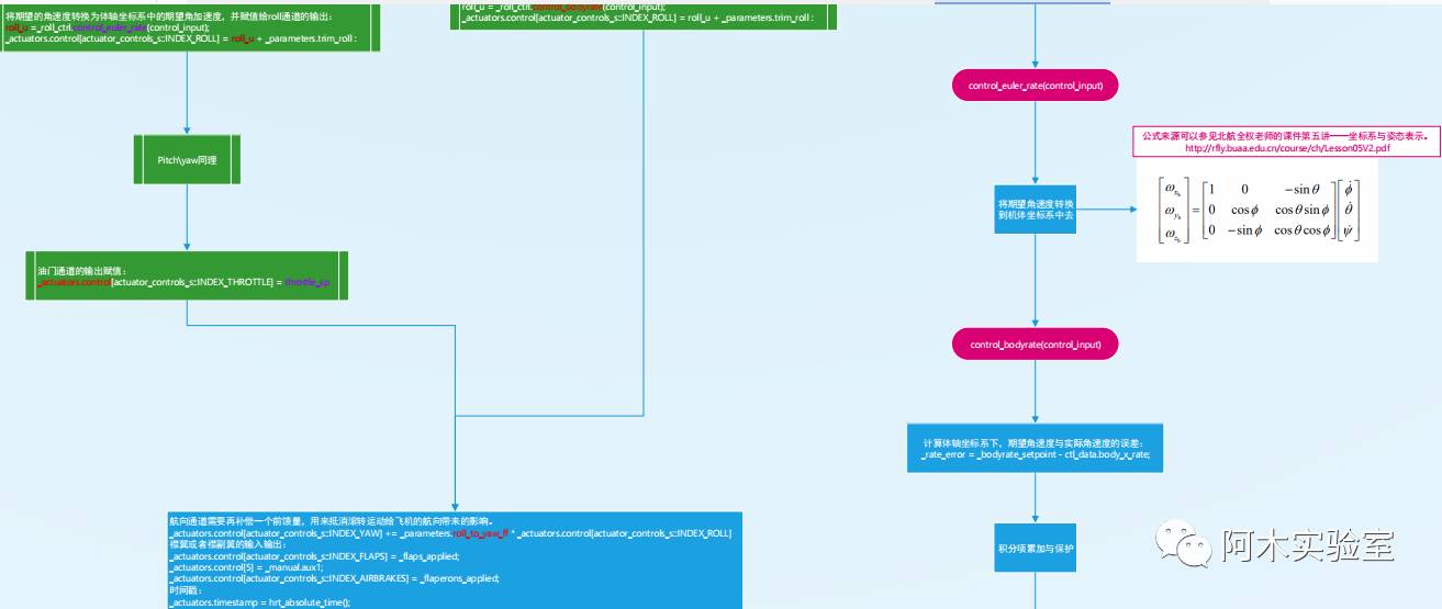 姿态控制:梳理PX4中固定翼姿态控制的实现流程,讲述手动或自动下姿态控制响应的不同,补充欧拉角速度和机体角速度之间的区别,结合源码学习姿态控制算法实现的过程。