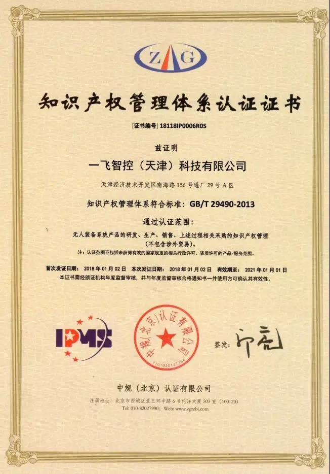1月2日,一飞正式通过国家级企业知识产权管理体系认证,系2018年开发区首家获得认证的企业。在贯标认证过程中,天津开发区科技局副局长徐代鸿亲自牵头到企业调研,为企业知识产权管理提出了宝贵指导意见。期间,一飞不仅得到了天津创智天诚知识产权代理事务所(普通合伙)辅导机构的专业指导,更获得中规(北京)认证有限公司的最终认可。
