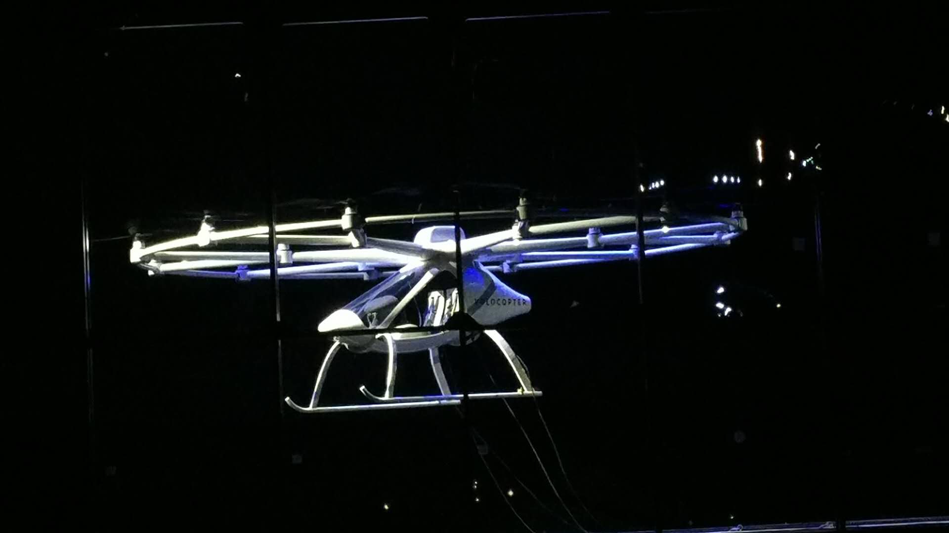 如果你觉得英特尔只会搞玩具级别的无人机,那你就错了。在发布会的最后一个环节,英特尔拉来了小伙伴 Volocopter。Volocopter 是一家来自于德国的创业公司,专注载人无人机的研发,现在团队只有50人左右,去年夏天获得戴姆勒集团的3000万美元投资。