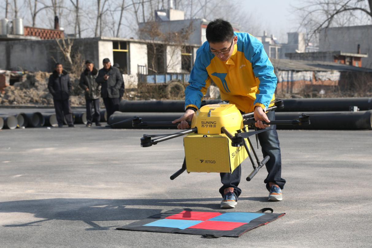 2017年12月,苏宁在安徽怀远、金寨、灵璧开通3条无人机航线,实现了常态化运营。以金寨县为例,它位于大别山腹地,是一个山路崎岖的地方,很多农村的空中直线距离只有几公里,但是放在地面,就需要走几十公里的山路。与以往不同的是,今年年货节期间,村民们在苏宁易购上购买的年货,可以直接无人机送到家,大大提高了收货时效。