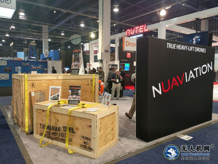 NUAVIATION公司的亮点产品是一款重型运载无人机,这款油动无人机其最大载重可达到200磅(90kg),飞机的最大飞行时间是20-45分钟。由于其运输的问题未能够在展会现场一睹芳容甚为遗憾。