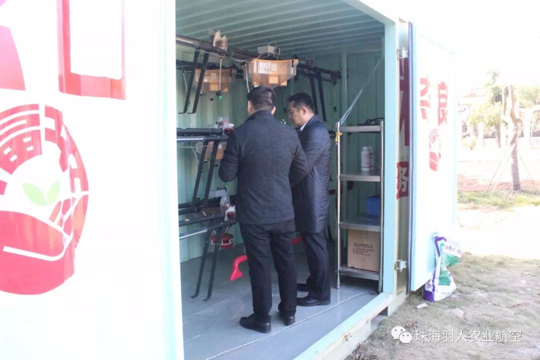 考察期间,领导率队来到户外场地观看了珠海羽人即将面向市场推出的“流动式共享农业无人机服务站”。该共享无人机服务站可根据不同农场、农业园农作物生长习性,流动投放,集装箱里装载20Kg大载荷多功能农用无人机、充电系统、太阳能系统、农药调配机、化肥混料机、原料仓、作业补给车、管理系统等一站式全套设备,当地农技人员或新型职业农民只要扫二维码、刷APP就可以打开集装箱门,使用无人机甚至使用配制好的农药或化肥,不会使用无人机的农民可以购买由服务站直接提供的无人机农药化肥喷施专业化一条龙服务。