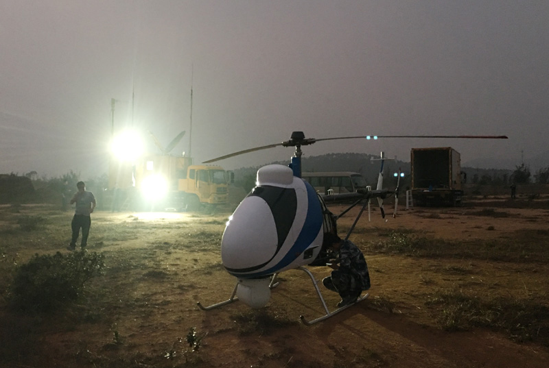 2018年1月22日晚,成功完成夜间巡检任务的无人直升机稳稳降落在空旷的地面。