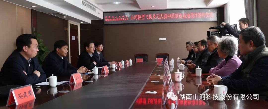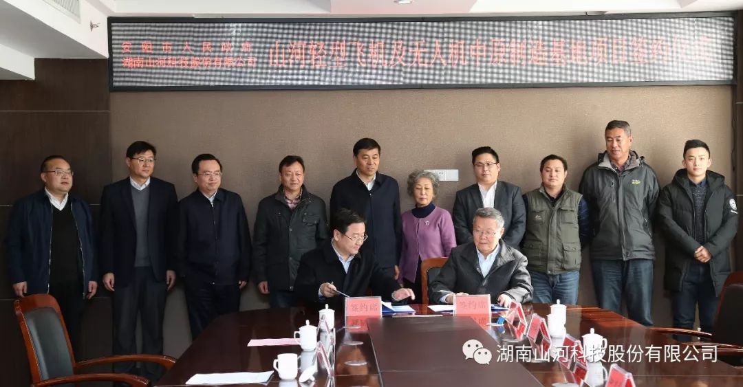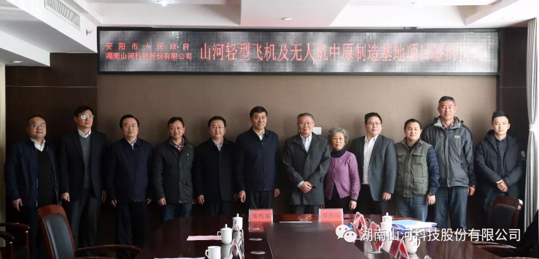 在河南省 “两会”开幕之际,2018年1月23日,安阳市与湖南山河科技股份有限公司合作建设山河轻型飞机及无人机中原制造基地项目签约仪式在郑州市举行。安阳市委书记李公乐、市委副书记、市长王新伟、副市长田海涛,山河科技董事长何清华、高级顾问易宇欣、总经理邹湘伏、副总经理肖黄兴出席签约仪式。