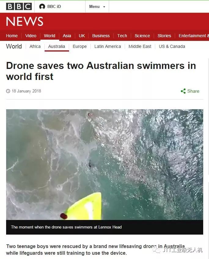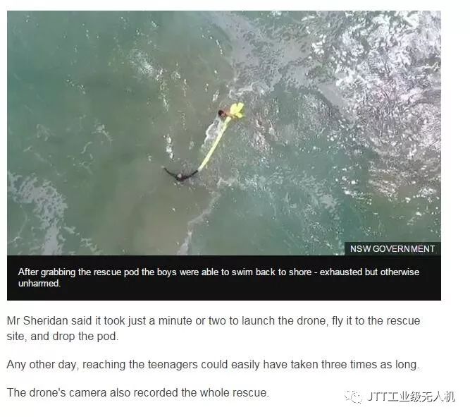近期,英国新闻广播机构BBC报道,澳大利亚新南威尔士州的救生员成功使用无人机解救了两名冲浪少年,从而避免了溺亡的悲剧发生,这是全球首次使用无人机进行海上救援。