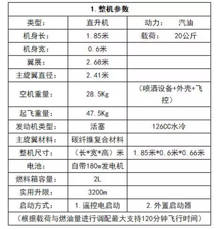 LY-F20L型植保油动无人直升机整机参数